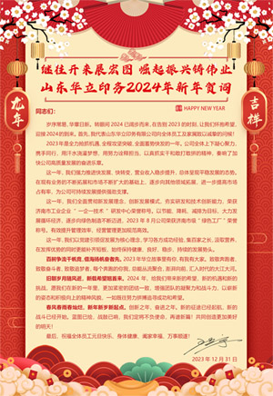 歲序常易,華章日新。轉(zhuǎn)眼間2024已闊步而來(lái),在告別2023的時(shí)刻,讓我們懷抱希望,迎接2024的到來(lái)。山東華立印務(wù)有限公司向全體員工及家屬致以誠(chéng)摯的問(wèn)候!2023年是全力搶抓機(jī)遇、全程攻堅(jiān)突破、全面